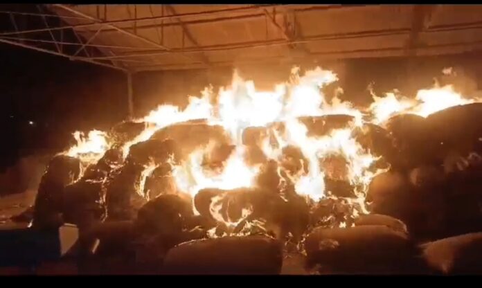 ఖమ్మం పత్తి మార్కెట్ యార్డ్ షెడ్ లో తగలబడుతున్న పత్తిబస్తాలు