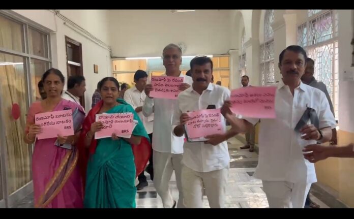 రైతు రుణమాఫీ హామీని అమలు చేయాలంటూ అసెంబ్లీలో బీఆర్ఎస్ ఎమ్మెల్యేల నిరసన