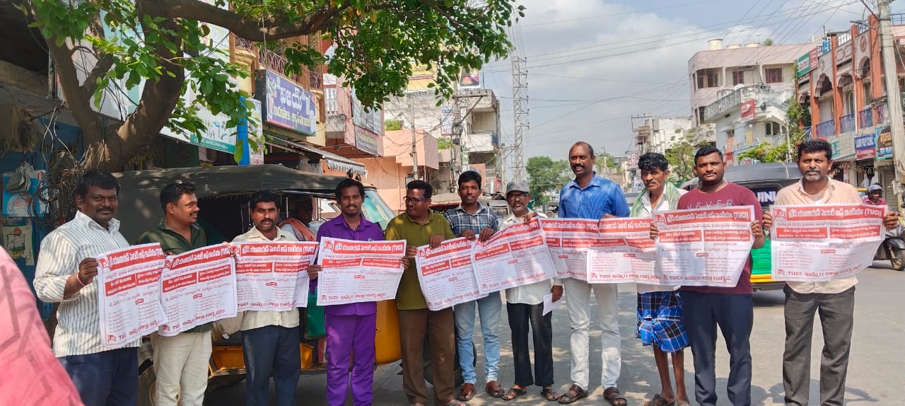 ట్రేడ్ యూనియన్ సెంటర్ ఆఫ్ ఇండియా (టి యు సి ఐ ఖమ్మం జిల్లా ప్రధమ మహాసభ ఈనెల 13న వైరా పట్టణంలో జరుగునుంది ఈ సభను జయప్రదం చేయాలని ఖమ్మం ఆటో అండ్ మోటార్ వర్కర్స్ యూనియన్ ఆధ్వర్యంలో పొట్టి శ్రీరాములు రోడ్లో పోస్టర్ ఆవిష్కరణ చేశారు ఈ సందర్భంగా ఆటో మోటార్ వర్కర్స్ యూనియన్ జిల్లా అధ్యక్షులు కంకణాల శ్రీనివాస్ జిల్లా ఉపాధ్యక్షులు ఎడ్లపల్లి ఉపేందర్ మాట్లాడుతూ టి యు సి ఐ జిల్లాలో కార్మిక హక్కుల కోసం అనేక పోరాటాలు చేస్తుందని కార్మికుల పక్షాన నీతిగా నిజాయితీగా పనిచేస్తుందని ఉద్యమాలను సమీక్ష చేసుకొని భవిష్యత్తు ఉద్యమ నిర్మాణం కోసం జరిగే సభను జయప్రదం చేయాలని వారు కోరారు మోడీ ప్రభుత్వం తీసుకొస్తున్న మోటార్ చట్టం బిల్లును వెంటనే ఉపసంహరించుకోవాలని వారి డిమాండ్ చేశారు మూలిగే నక్కపై తాటికాయ పడ్డ చందంగా మోడీ ప్రభుత్వం పెట్రోల్ డీజిల్ రేట్లు పెంచి మోటార్ కార్మికులను రోడ్లపాలు చేస్తుందని పెంచిన పెట్రోల్ డీజిల్ రేట్లు తగ్గించే వరకు ఆటో మోటార్ కార్మికులు పోరాడాలని వారి పిలుపునిచ్చారు అదేవిధంగా వైరాలో ఈనెల 13న జరిగే TUCI జిల్లా ప్రధమ మహాసభకు ఆటో మోటార్ కార్మికులు పెద్ద ఎత్తున పాల్గొని జయప్రదం చేయాలని వారు పిలుపునిచ్చారు ఈ ఈ పోస్టర్ ఆవిష్కరణ కార్యక్రమాలు టి యు సి ఐ నగర అధ్యక్షులు ములకలపల్లి లక్ష్మీనారాయణ, అక్కి నాగరాజు, నాగన్న, సాదిని ఎల్లయ్య, విజయ్, రాము, చింటూ, అన్వేష్, తదితరులు పాల్గొన్నారు.
